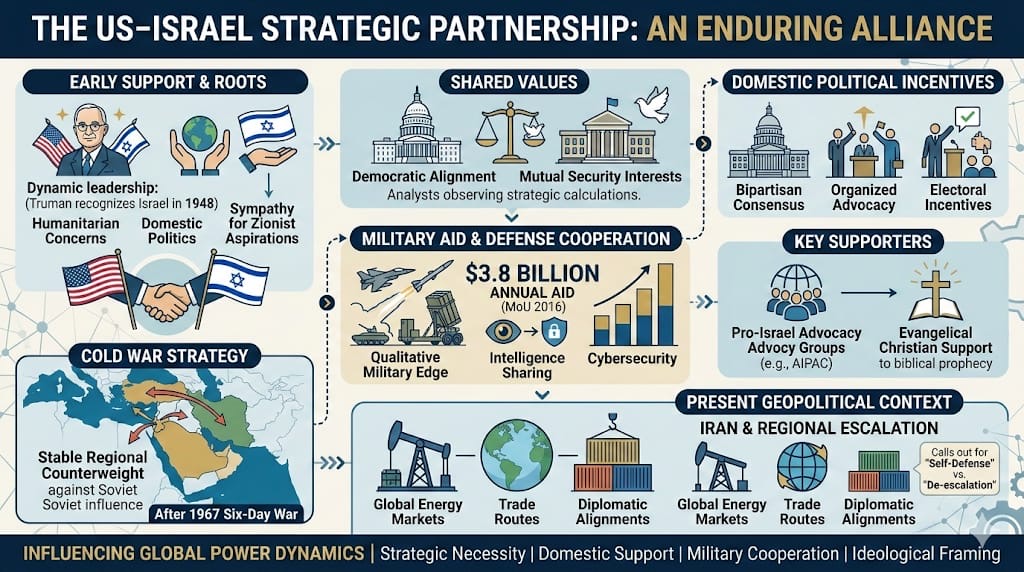 As geopolitical tensions involving Iran intensify, the US–Israel strategic partnership continues to influence decisions in Washington and beyond. Its foundations — strategic necessity, domestic political backing, military cooperation, and ideological framing — make it one of the most stable and consequential alliances in contemporary geopolitics.